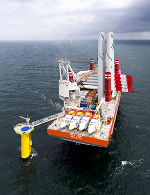 Special installation vessels install the wind turbines offshore. The "Bold Tern" (photo) braces itself against the sea floor on four extensible steel pilings, and can thus be used largely independently of currents and wave conditions. The specialized ship can hold the towers, nacelles, and rotor blades for up to eight wind turbines. |